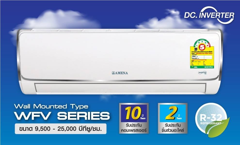 - เป็นเครื่องปรับอากาศ ชนิดติดผนัง WFV DC. INVERTERได้รับการรับรองฉลากประหยัดไฟเบอร์ 5 แบบ Variable Speed ตามมาตรฐานของ กฟผ.ใหม่ล่าสุดได้รับมาตรฐานผลิตภัณฑ์อุตสาหกรรม มอก.2134-2553แผ่น Filter กรองฝุ่นชนิดตะแกรงพลาสติก สามารถถอดล้างทำความสะอาดได้ฟอกอากาศด้วย Vitamin C & Anti Bacterial Filter ช่วยให้ผิวหนังชุ่มชื่นด้วย Vitamin C และช่วยยับยั้งแบคทีเรียแผ่นฟอกอากาศชนิด HEPA Fiter With Activated Carbon สามารถกรองฝุ่นขนาดเล็ก 0.3 ไมครอน พร้อมช่วยดูดซับกลิ่นไม่พึงประสงค์ควบคุมการทำงานด้วยรีโมทคอนโทรลไร้สายตัวเครื่องแสดงอุณหภูมิที่ตั้งไว้ พร้อมสัญลักษณ์การทำงานต่าง ๆรับประกันคอมเพรสเซอร์ 10 ปี และ รับประกันอะไหล่ 2 ปี
